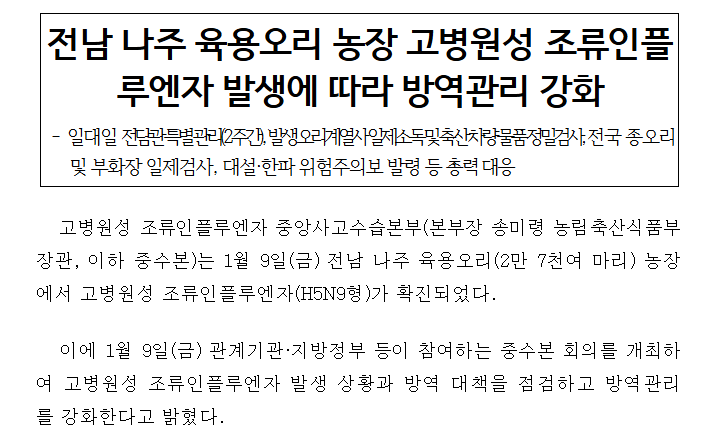 전남 나주 육용오리 농장 고병원성 조류인플루엔자 발생은